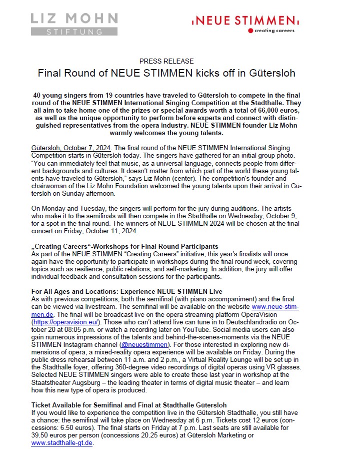 On Monday and Tuesday, the singers will perform for the jury during auditions. The artists who make it to the semifinals will then compete in the Stadthalle on Wednesday, October 9, for a spot in the final round. The winners of NEUE STIMMEN 2024 will be chosen at the final concert on Friday, October 11, 2024.